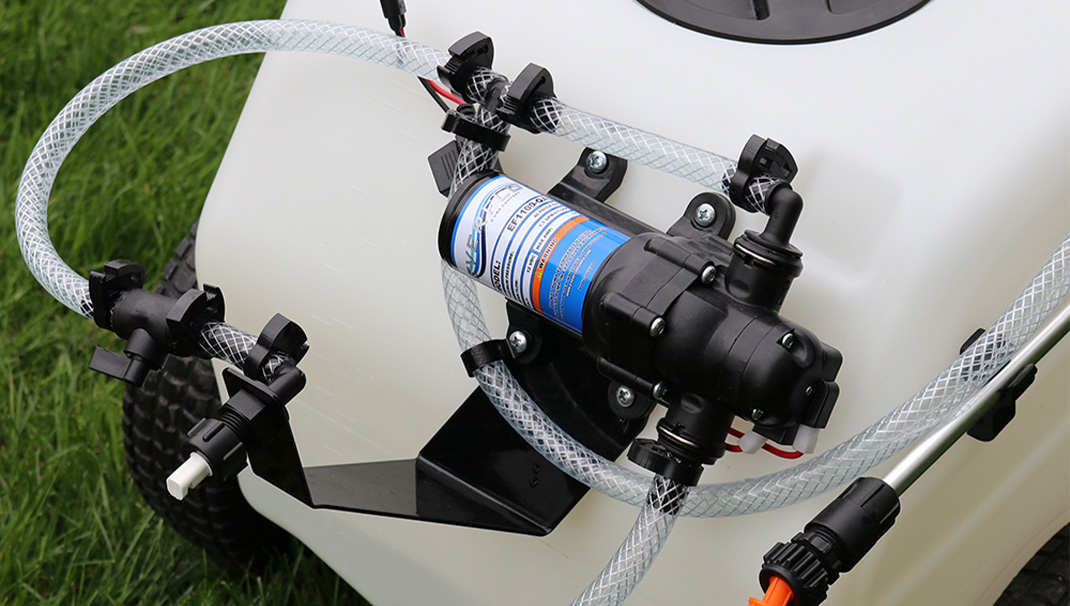 This 12 Gallon Rechargeable Lithium-Ion Spot & Broadcast Lawn Trailer Sprayer easily tackles even the most rugged terrain with the never-flat, 10” foam tires. It features a top-of the-line pumping system that includes a highly durable Everflo 1.1GPM quick attach 12V on-demand diaphragm pump that is perfect for spraying up to 40 PSI.