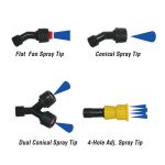 Spray Tips: This lever action backpack sprayer includes four unique spray tips for a wide range of applications. (1) Flat fan spray tip, (1) Conical spray tip, (1) Dual conical spray tip, and (1) 4-Hole adjustable spray tip.